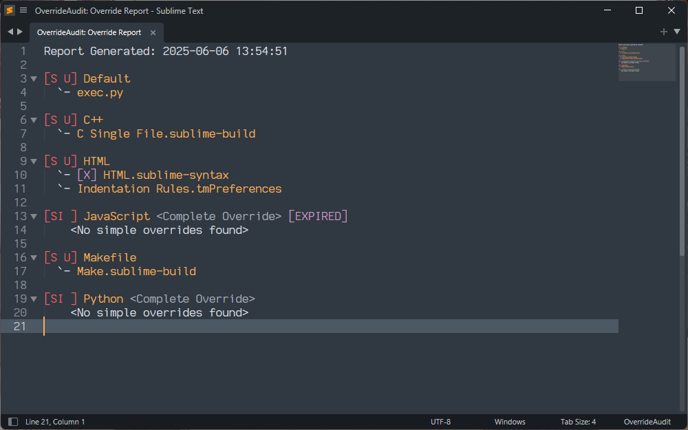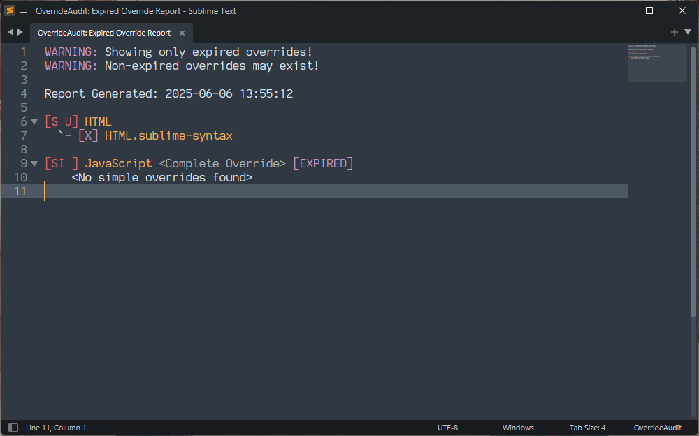 An Expired Only Override Report is created automatically by OverrideAudit whenever Sublime Text starts and the version number is different than it was on the last run (i.e. Sublime has been updated).